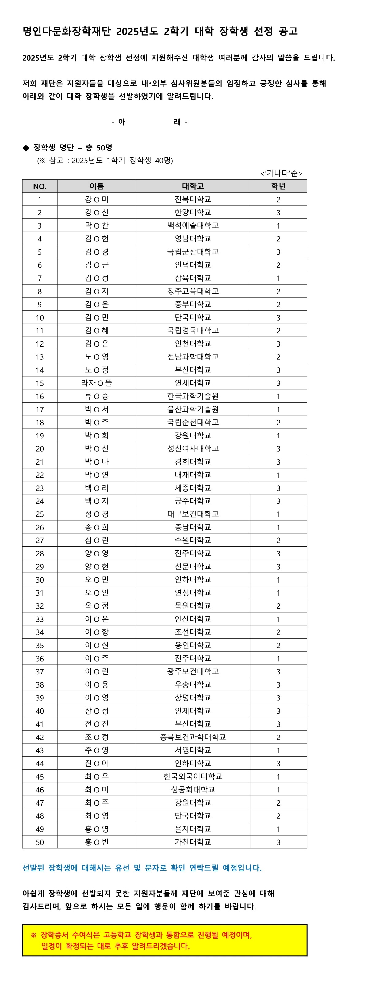 명인다문화장학재단 2025년도 2학기 대학 장학생 선정 공고